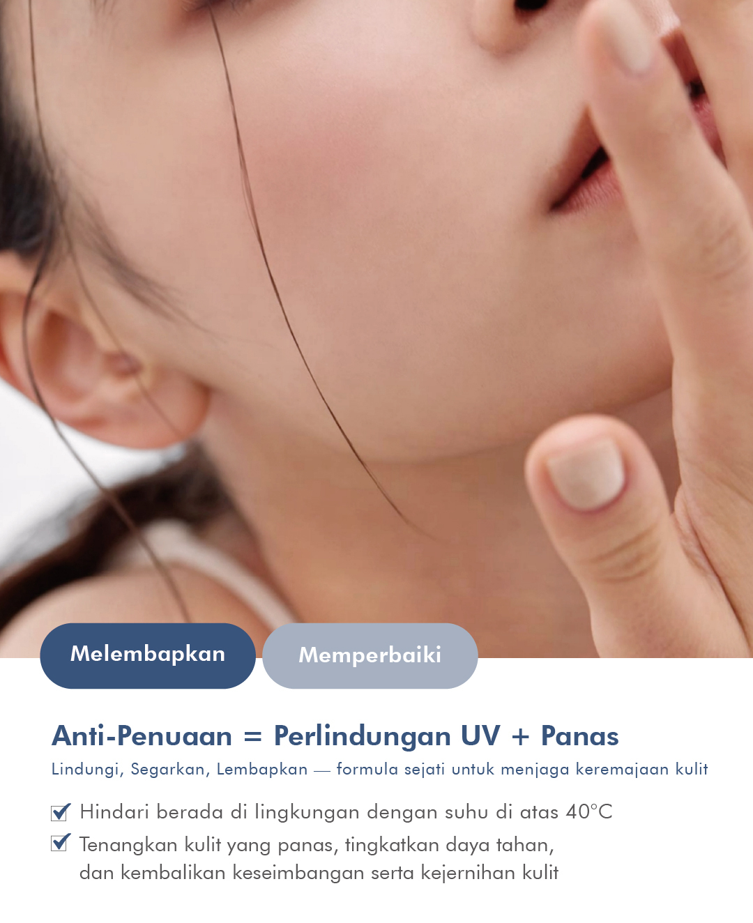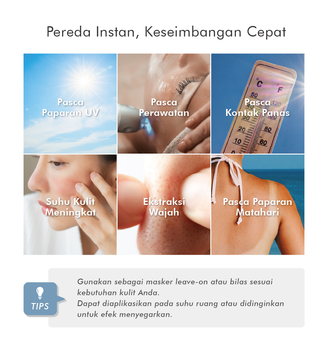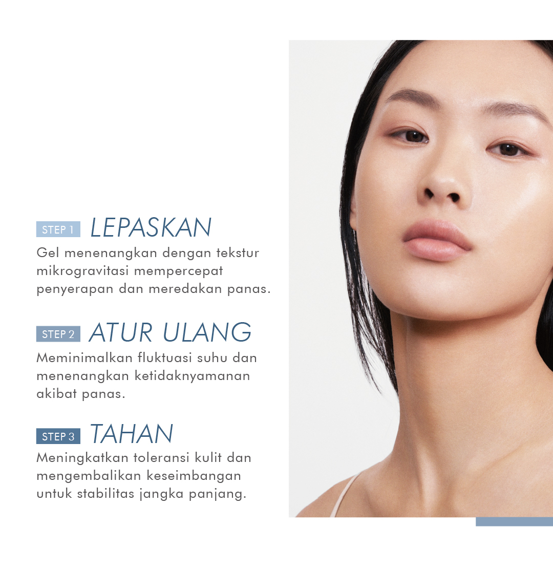 Diformulasikan dengan elemen menenangkan untuk kulit sensitif dan mudah teriritasi, serta melindungi kulit yang rentan terhadap kemerahan akibat suhu tinggi. Produk ini juga membantu menjaga kelembapan dan mengembalikan keseimbangan kulit. Cocok untuk perawatan kulit pasca-treatment.