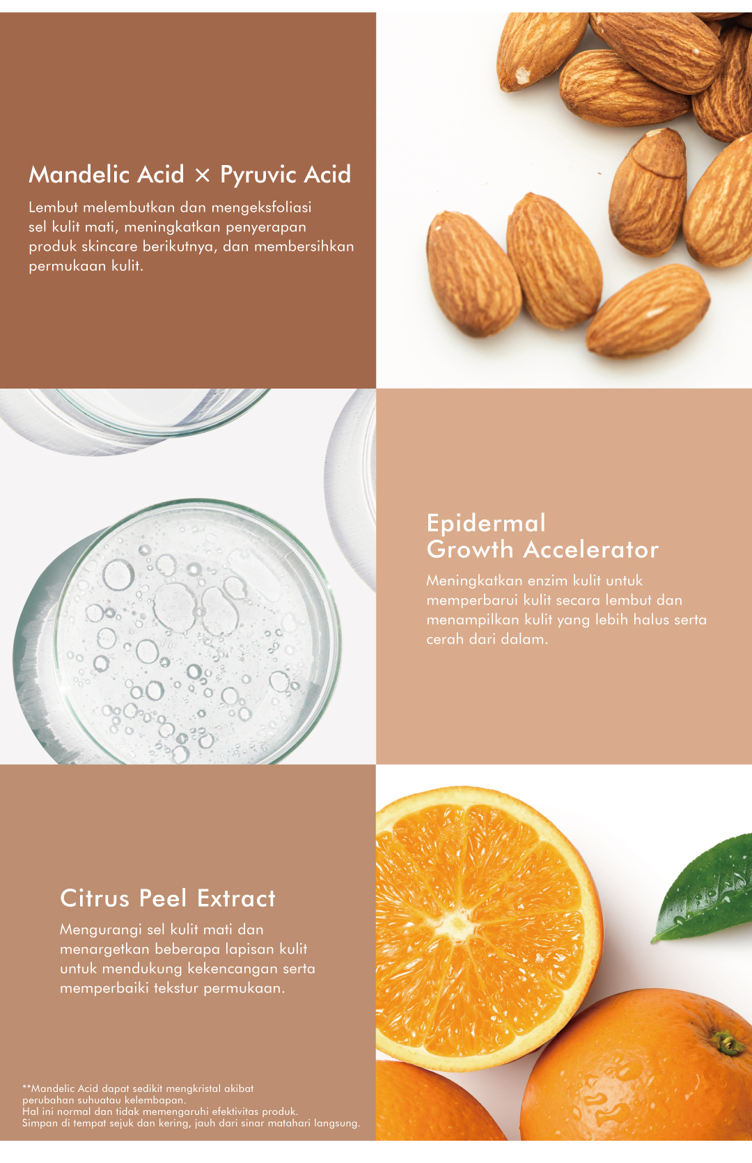 Eksfolian dengan Mandelic Acid, AHA, dan bahan peeling canggih untuk mengurangi noda dan bekas jerawat, memberikan kulit hasil yang lebih halus dan warna merata.