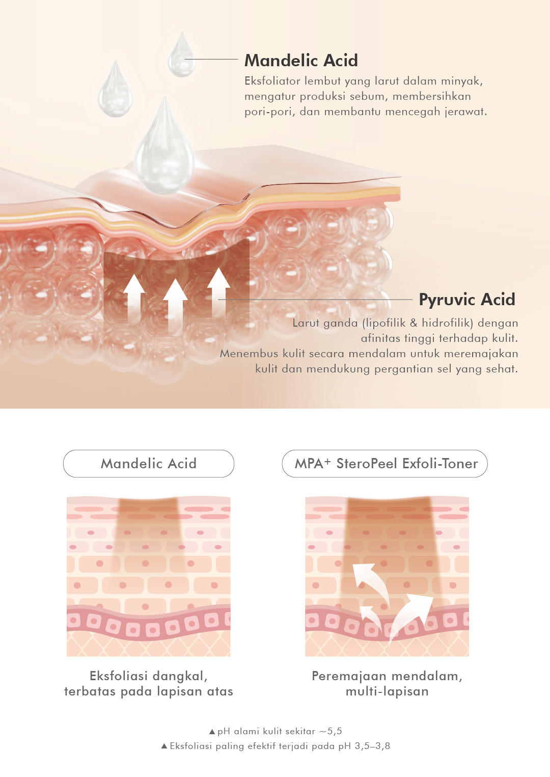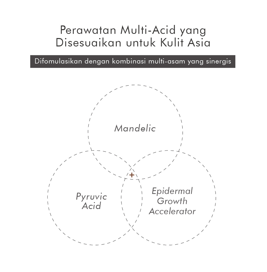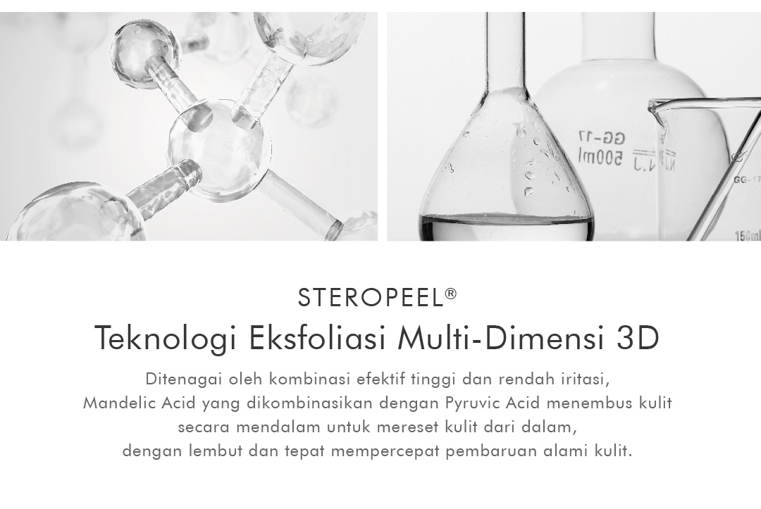 Eksfolian dengan kandungan Mandelic Acid dan AHA, berfungsi untuk mengecilkan pori-pori dan mengangkat sel kulit mati, sehingga wajah terlihat lebih cerah dan bersih.