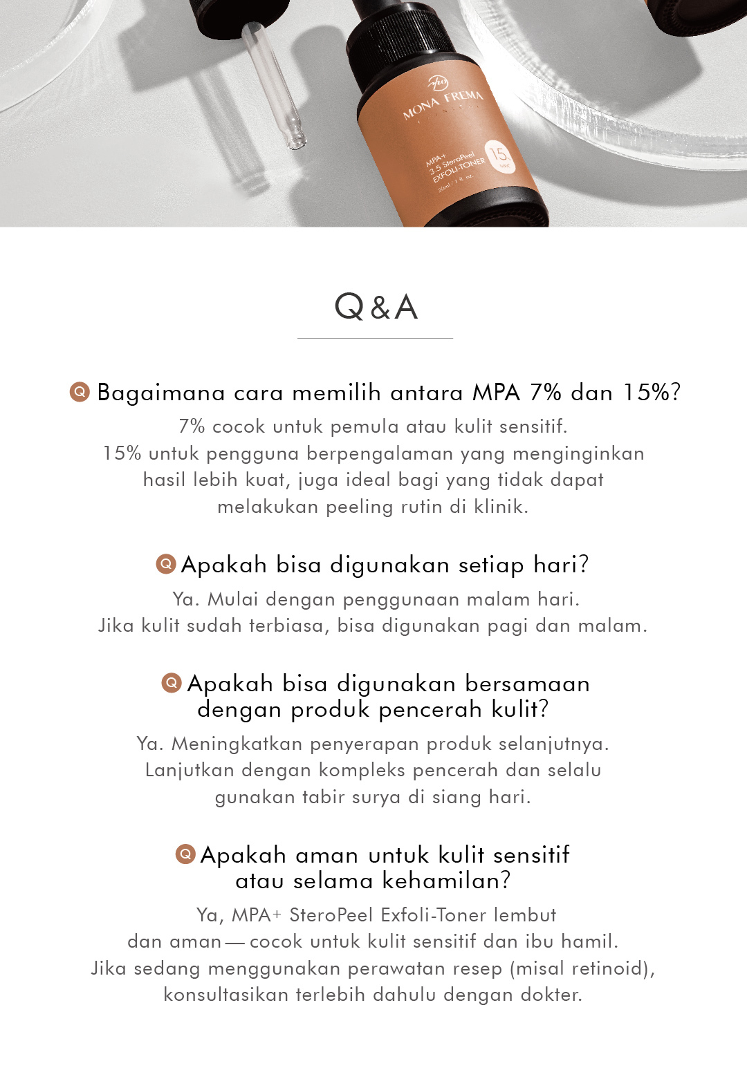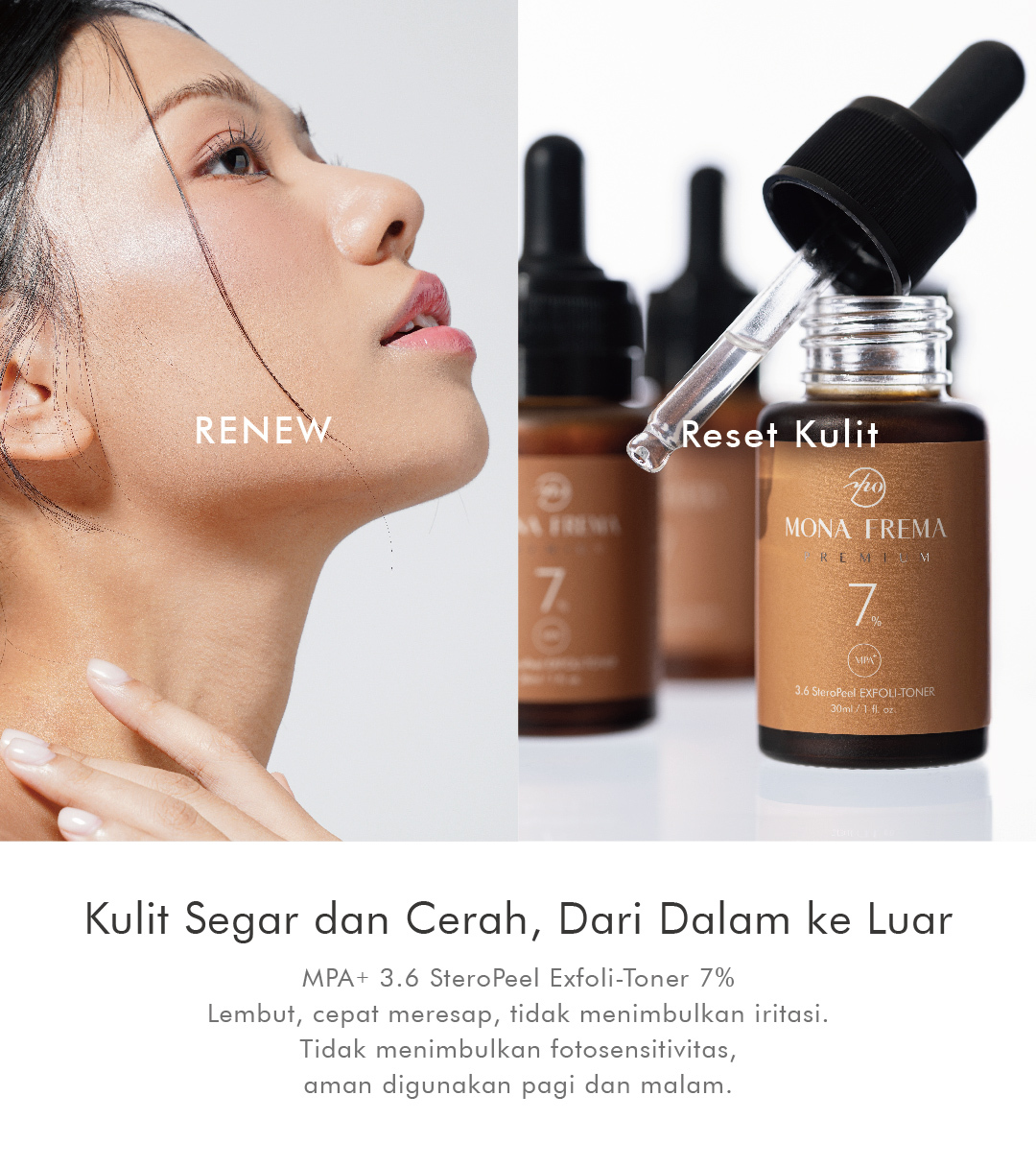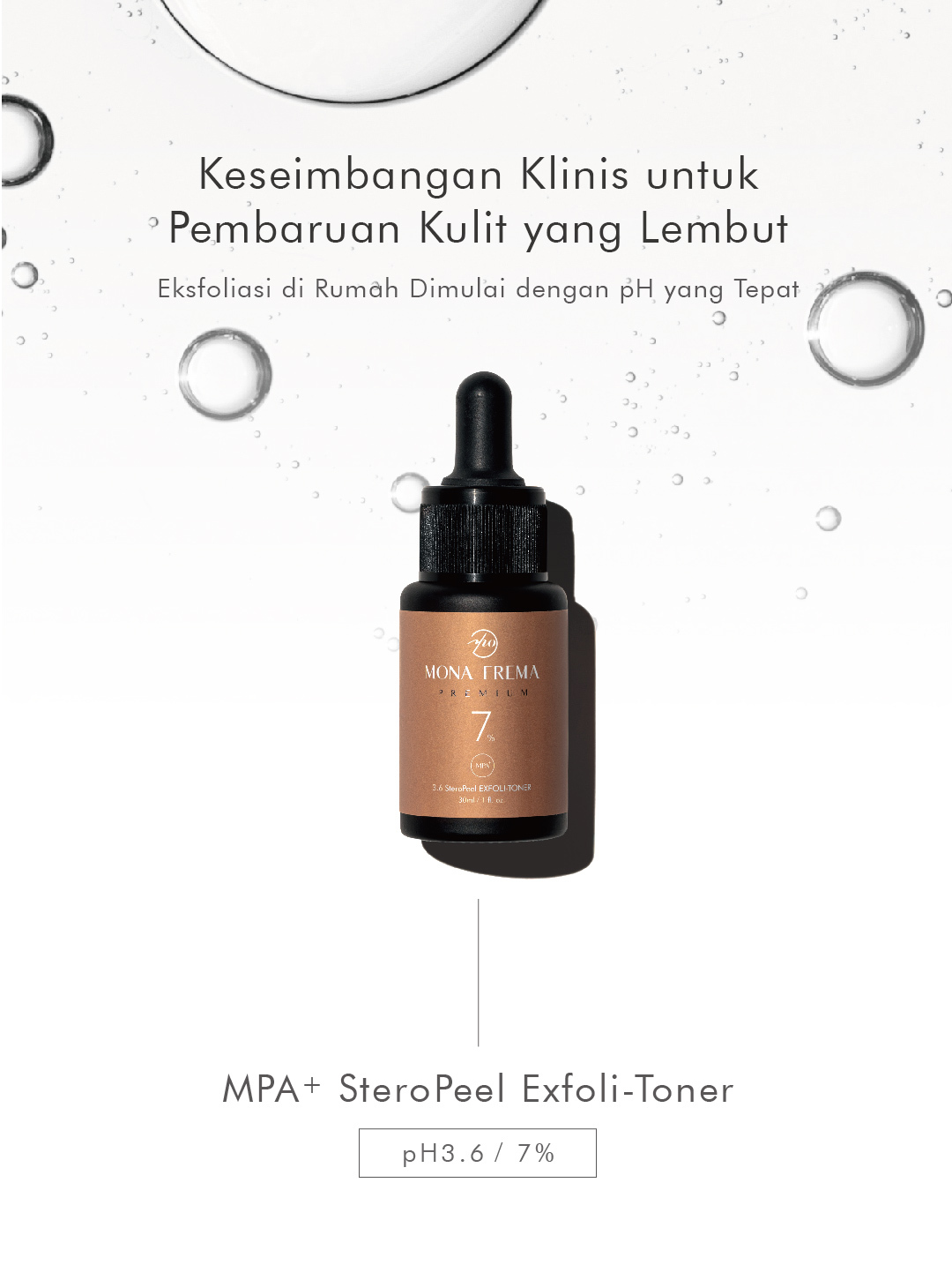 Eksfolian dengan kandungan Mandelic Acid dan AHA, berfungsi untuk mengecilkan pori-pori dan mengangkat sel kulit mati, sehingga wajah terlihat lebih cerah dan bersih.