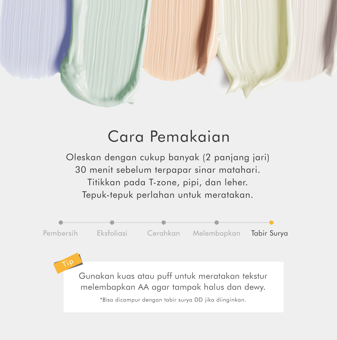 Sunscreen yang berfungsi ganda sebagai primer dan penghalang sinar UV. Varian AA diformulasikan dengan tekstur ringan untuk membantu menjaga kelembapan kulit dan mencegah pengelupasan akibat paparan sinar matahari.