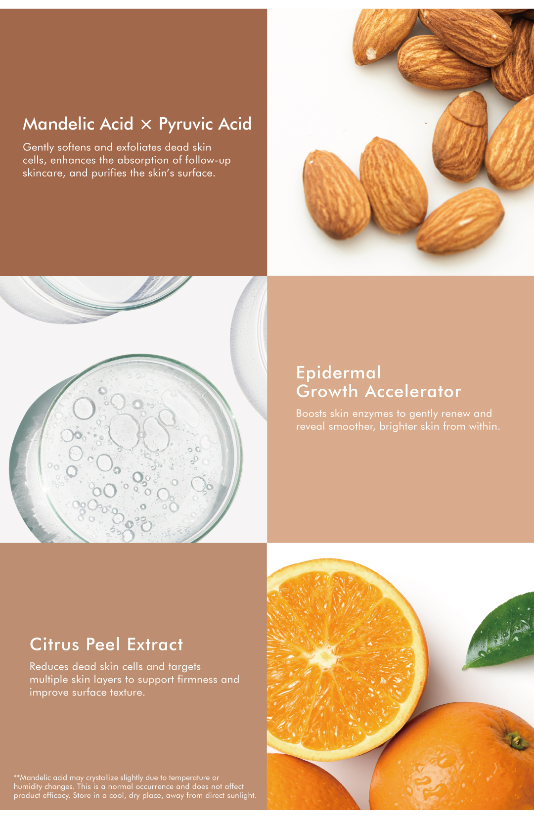 A leave-on exfoliant containing Mandelic Acid, AHA, and advanced peeling ingredients works to reduce imperfections, promoting a tighter, evenly toned skin.