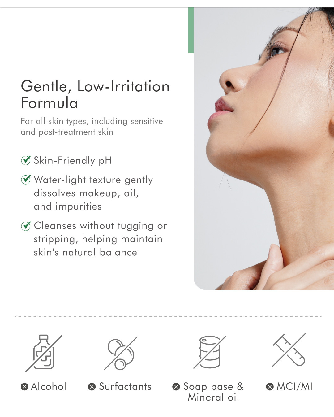 An oil-free, mild formula that effortlessly removes makeup, sunscreen products, oil, dirt, and impurities. It ensures a deep cleanse without compromising the moisture barrier while also balancing the skin's pH level.