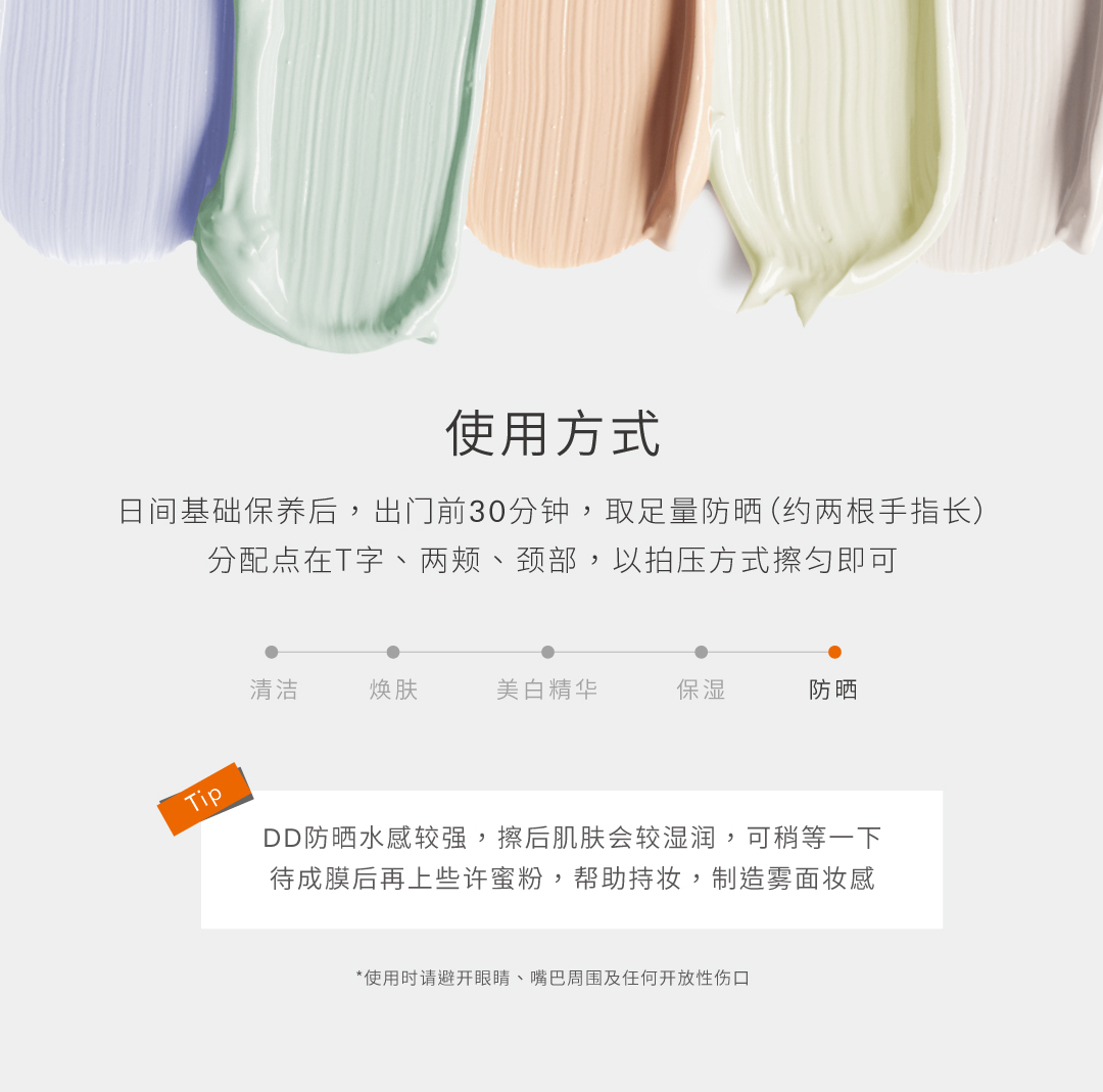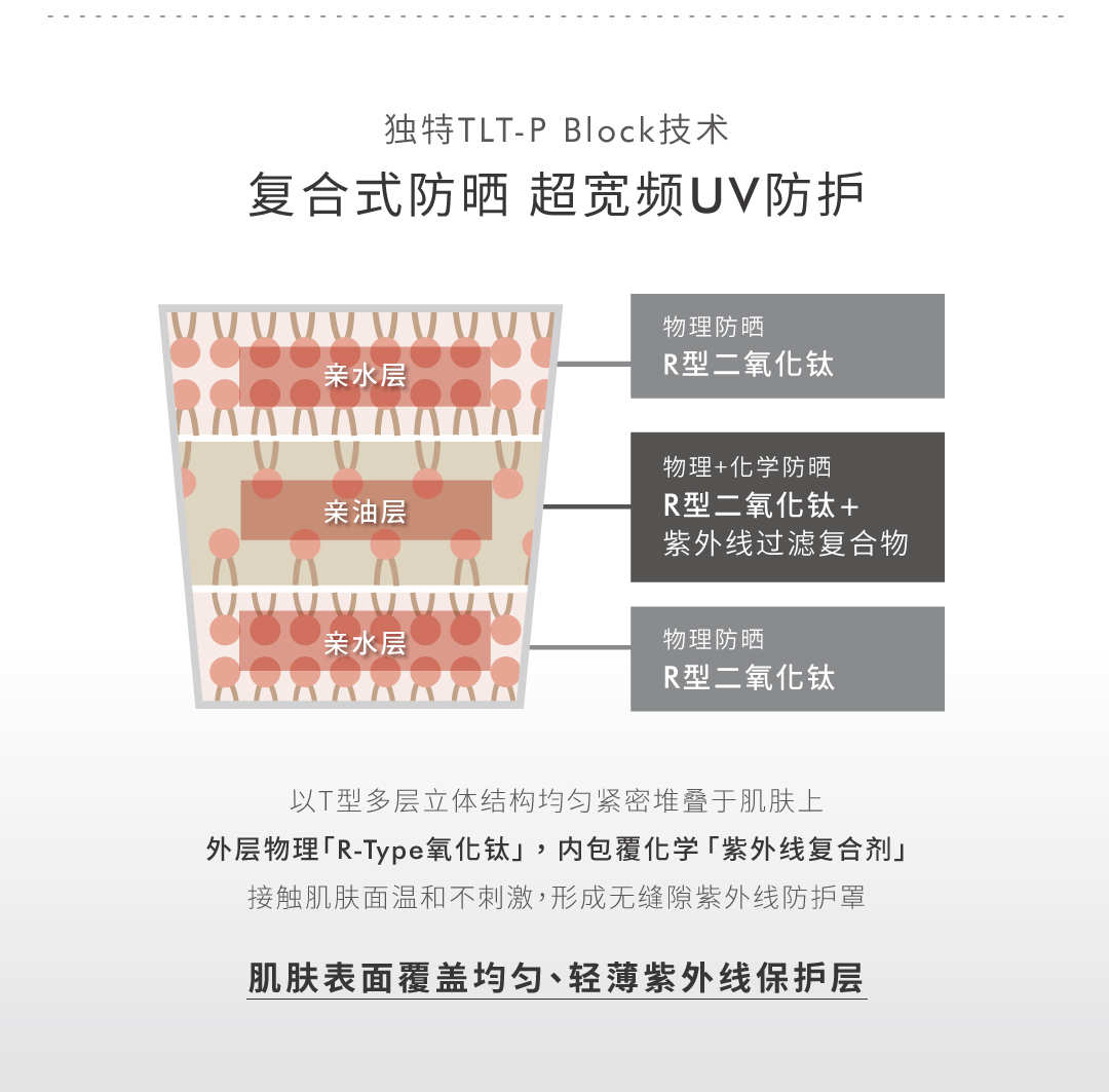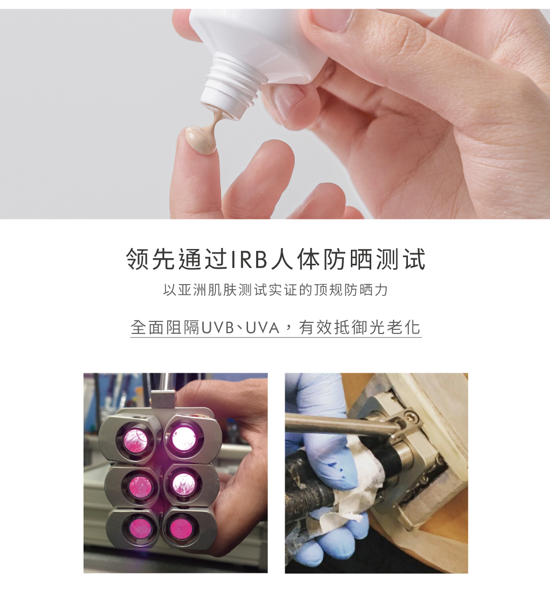 超宽频SPF 50+/PA++++,轻盈舒适肤触之余,贴合各种肤色,全方位防晒、轻盈、润色一瓶到位,同时遮盖肌肤瑕疵,呈现自然明亮的肤色