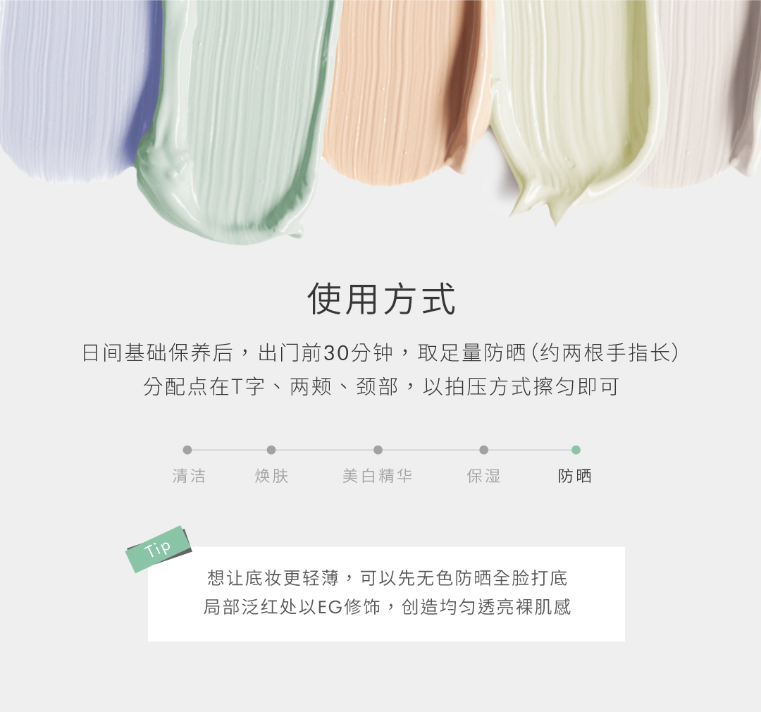 以超高紫外线防御力与修饰泛红及痘痘肤色为主要诉求的绿色防晒饰底,隐形防护,调整肤色不均,轻松打造自然半哑光妆容