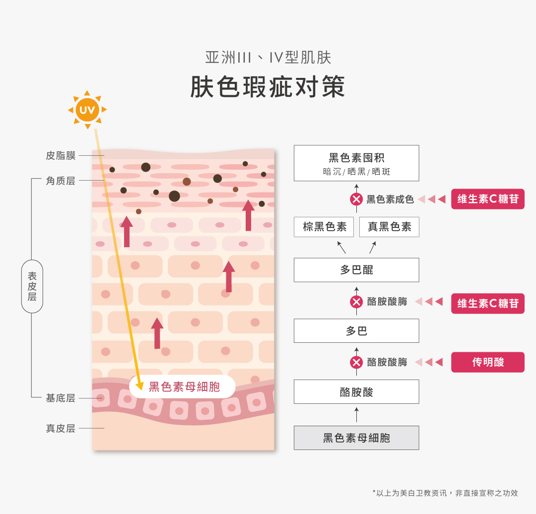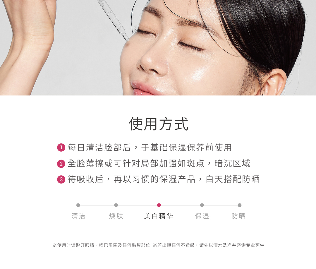 针对根源五大肤色瑕疵成因,对抗暗沉蜡黄与肤色不均,里应外合攻破阻白障碍,全面提升肌肤白皙透亮光泽