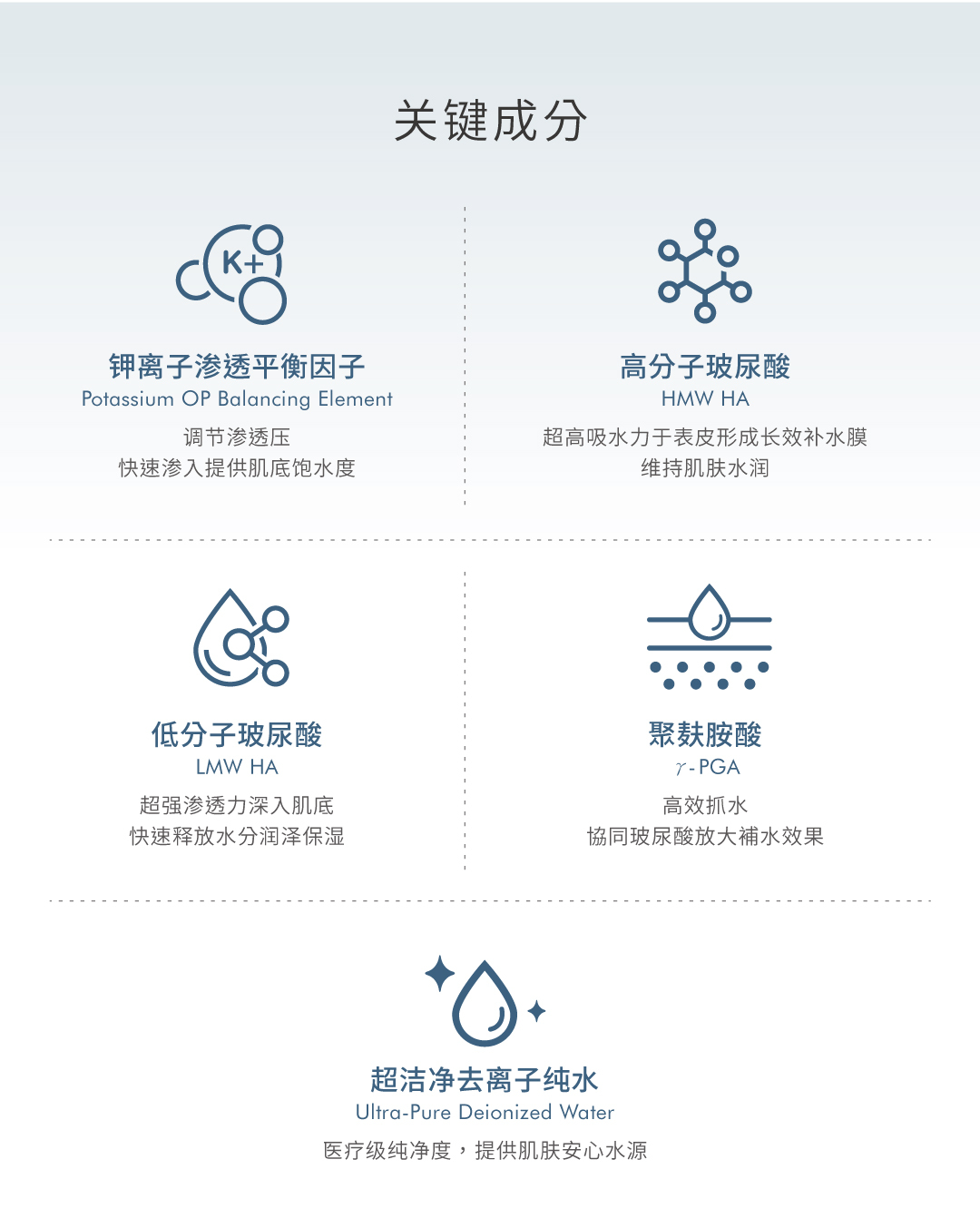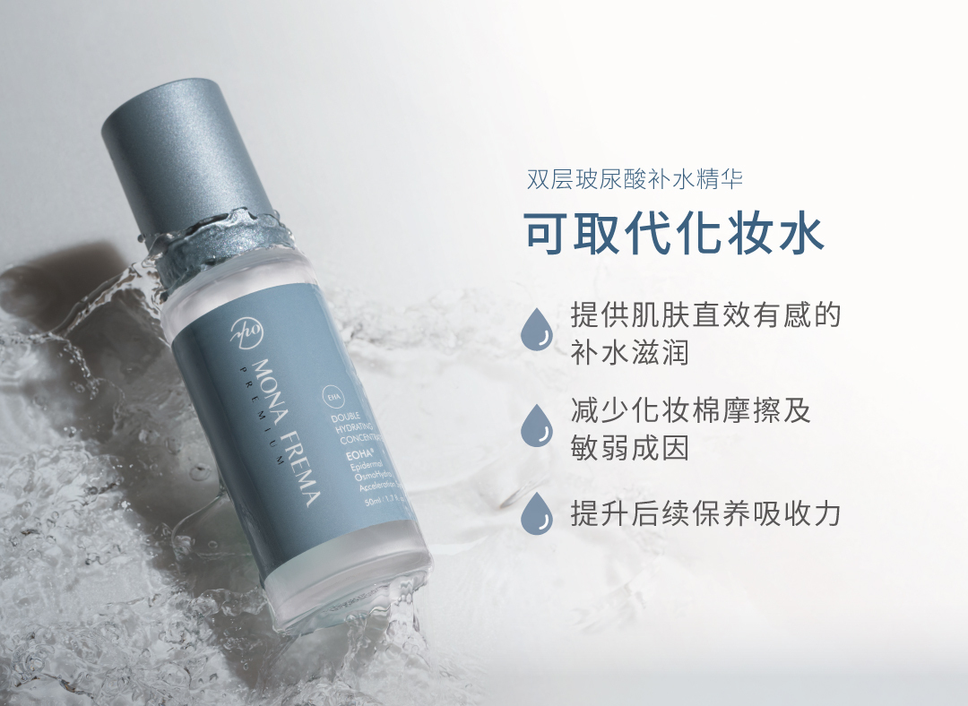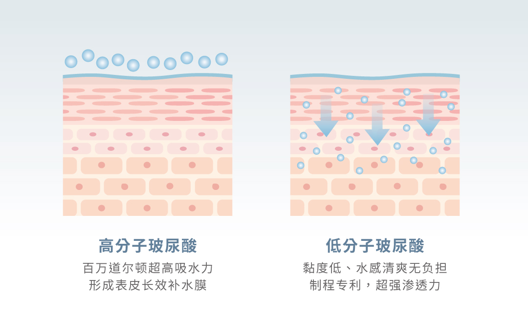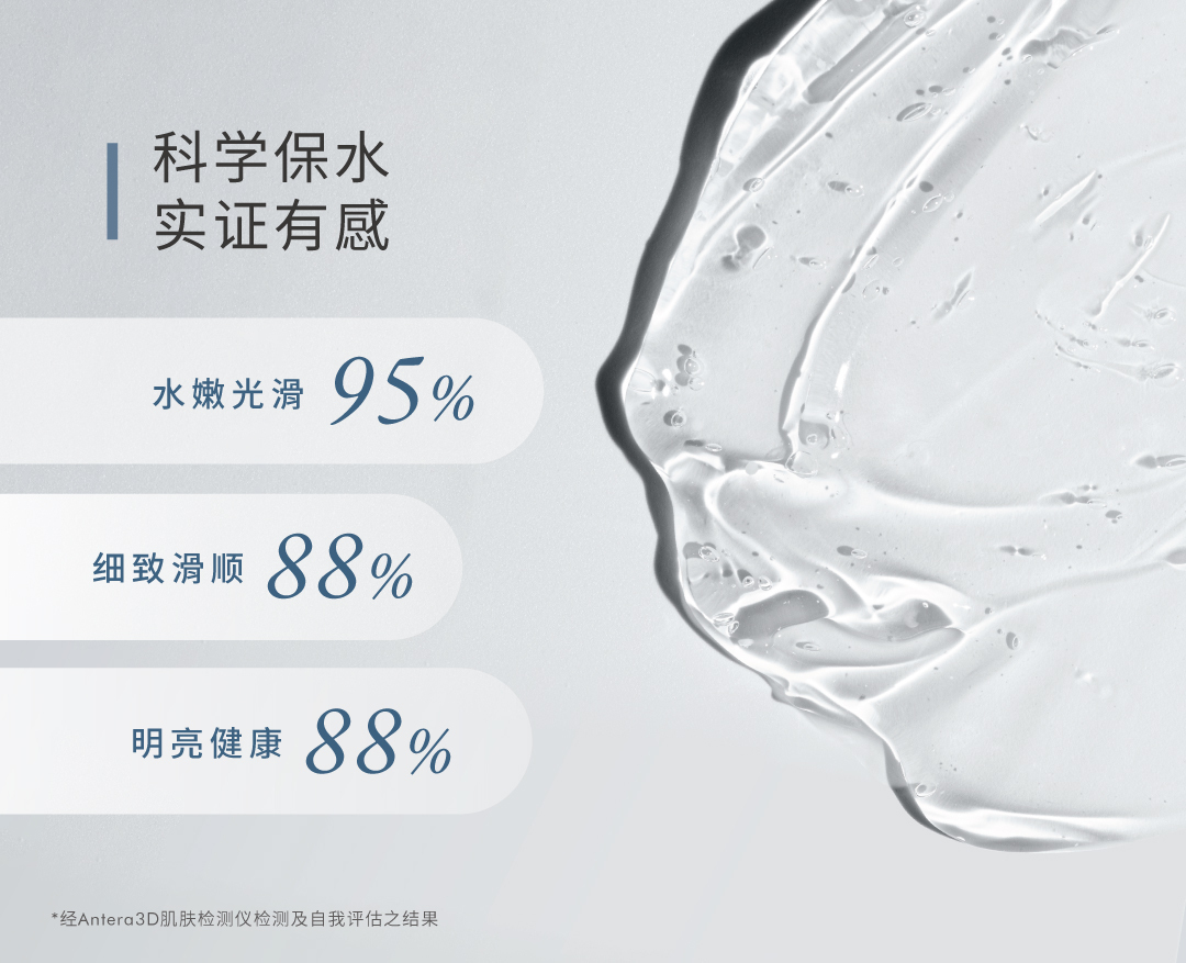 运用渗透压补水技术,结合高、低分子双层玻尿酸及多重高效保湿成分,轻盈不黏腻,渗透肌底深层直效补水与修护,促进肌肤锁住水分,提升肌肤水、润、弹, 养成透亮健康肌