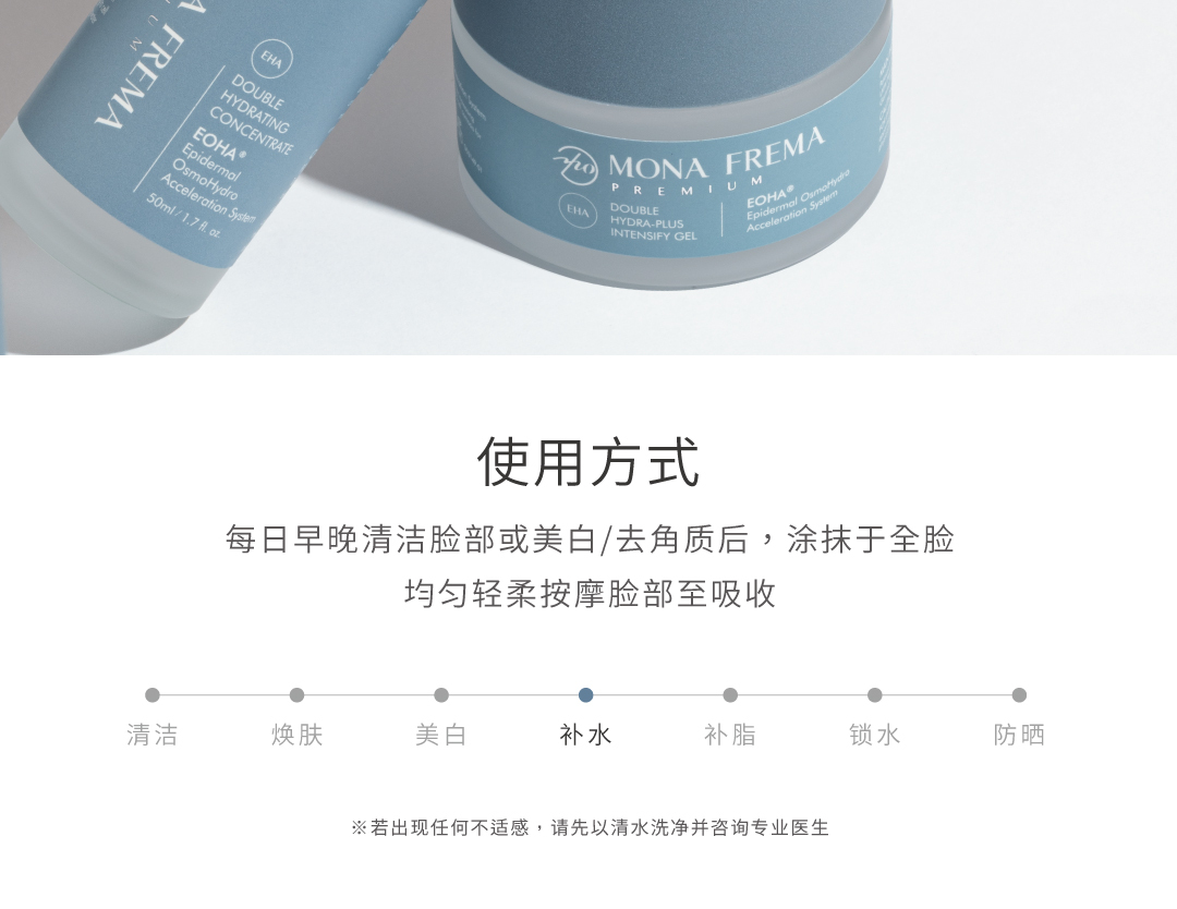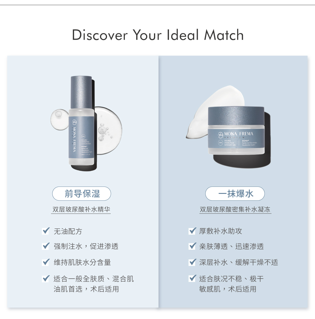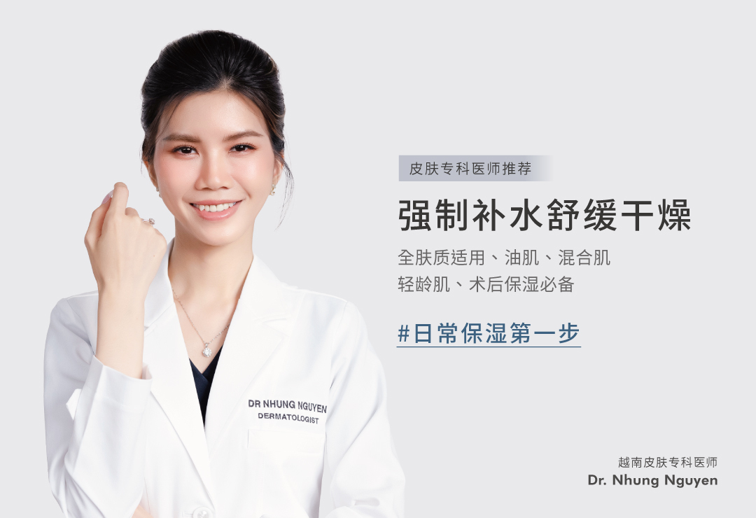运用渗透压补水技术,结合高、低分子双层玻尿酸及多重高效保湿成分,轻盈不黏腻,渗透肌底深层直效补水与修护,促进肌肤锁住水分,提升肌肤水、润、弹, 养成透亮健康肌