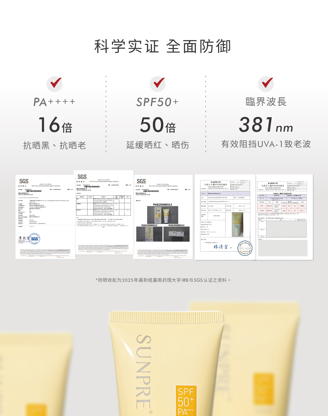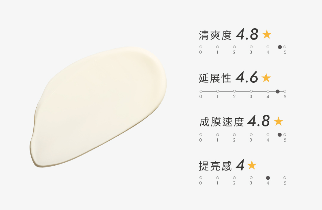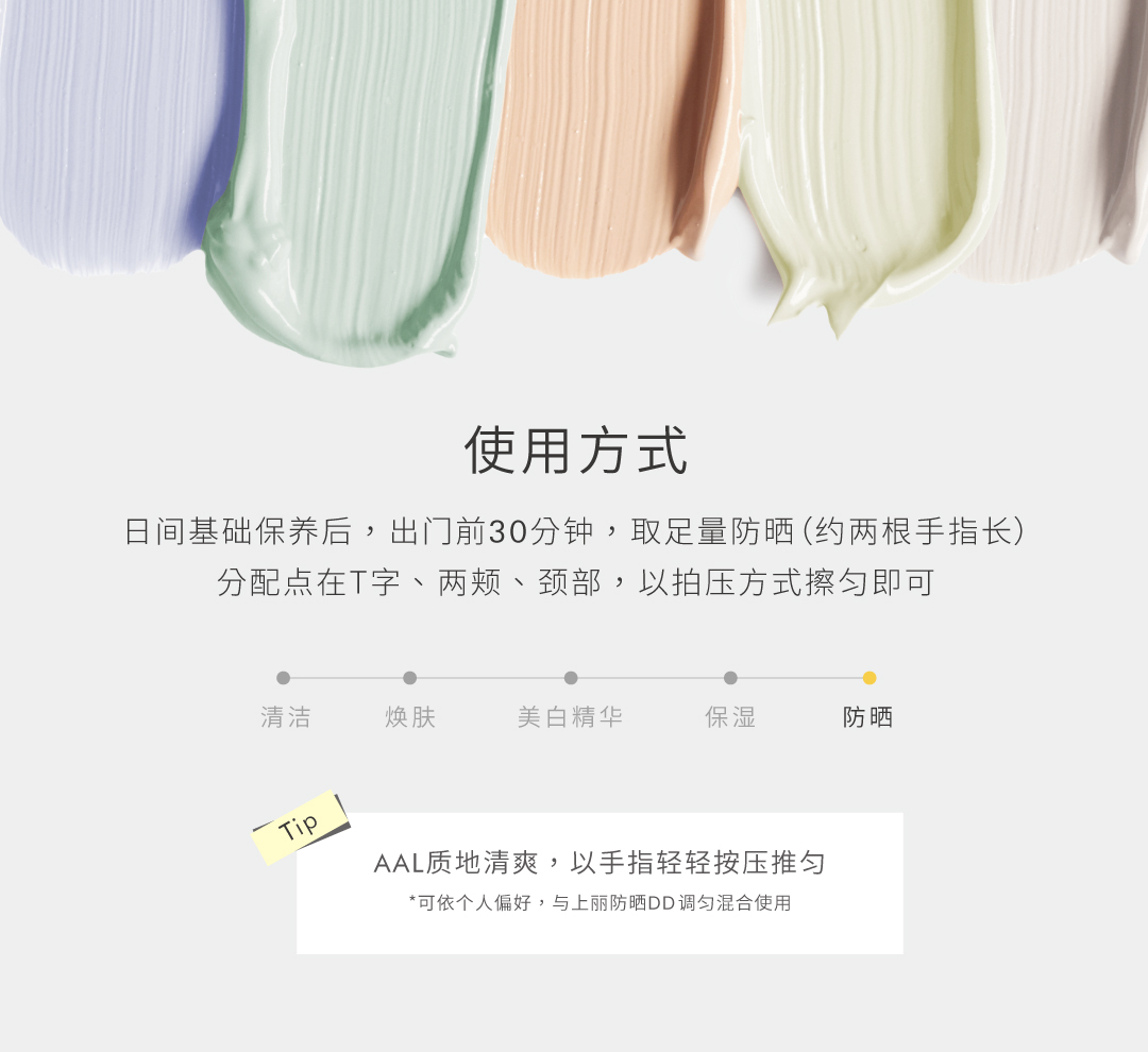 拥有最高防晒等级SPF50 PA+++++ ,零肌感、轻盈水感质地,柔敏抗UV,亦适合当妆前乳使用,单擦、混色、叠擦都ok