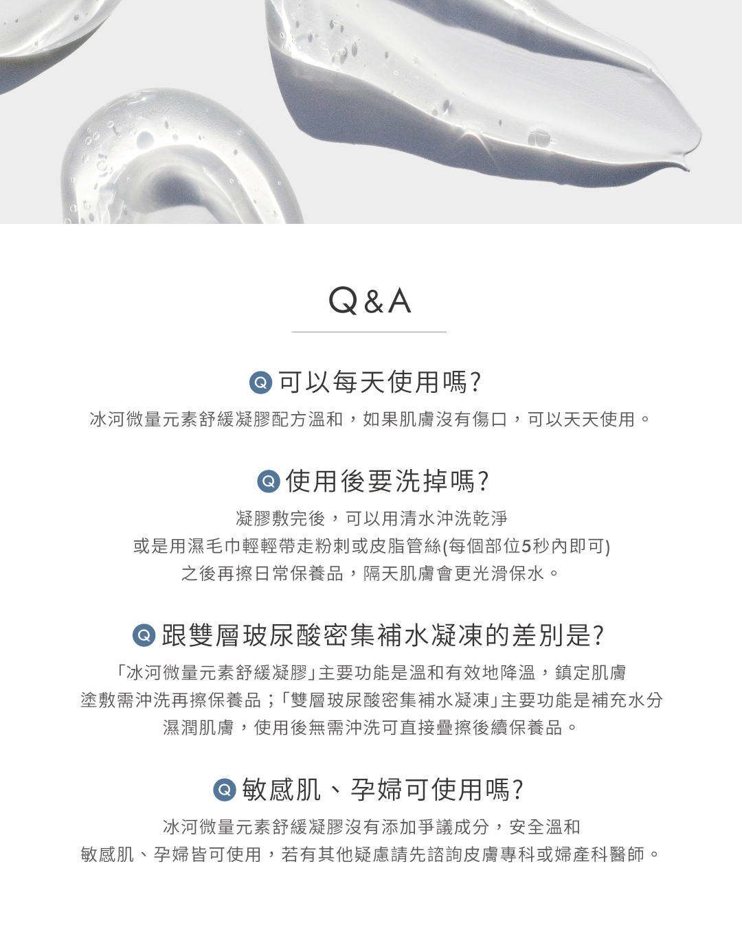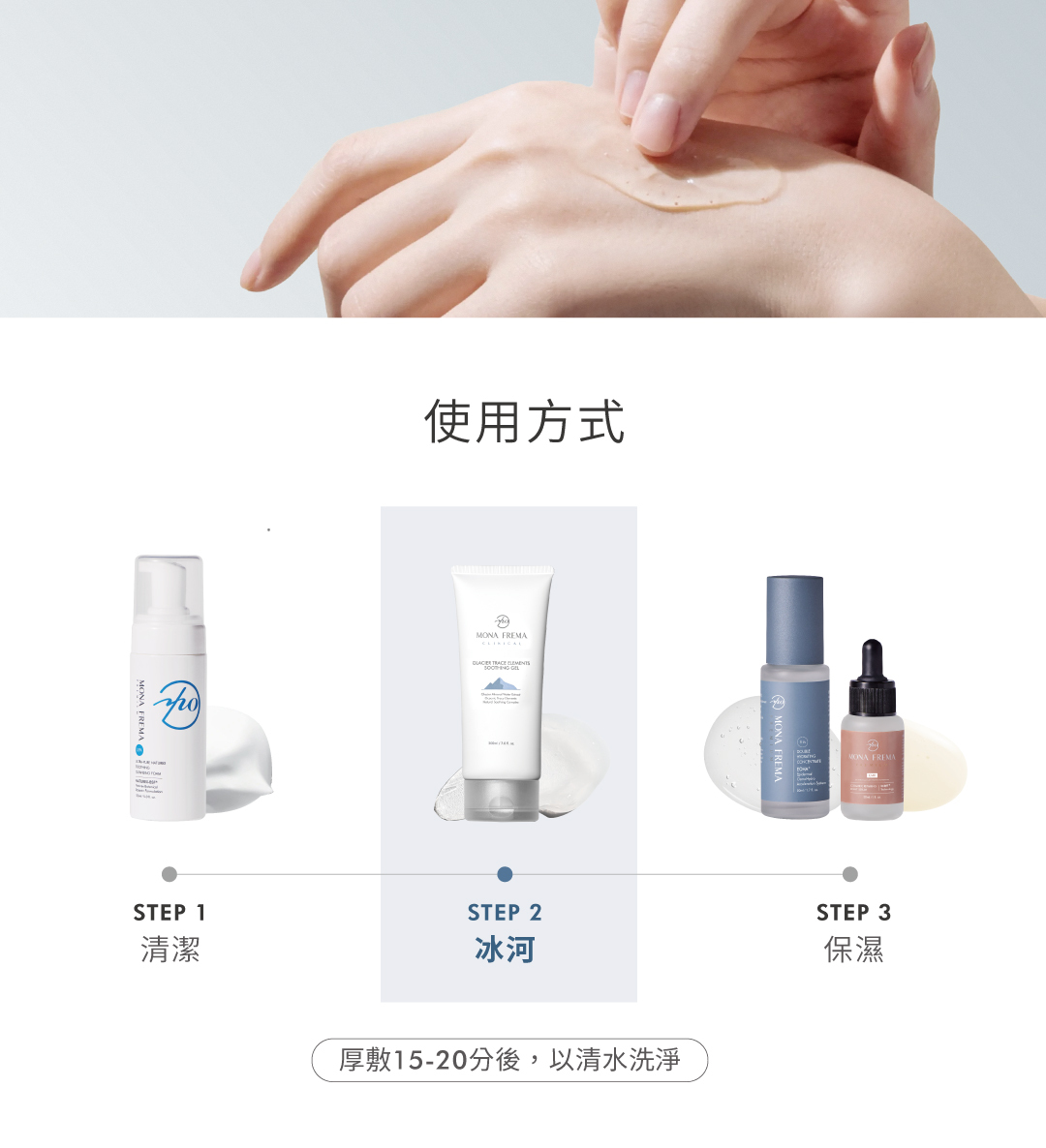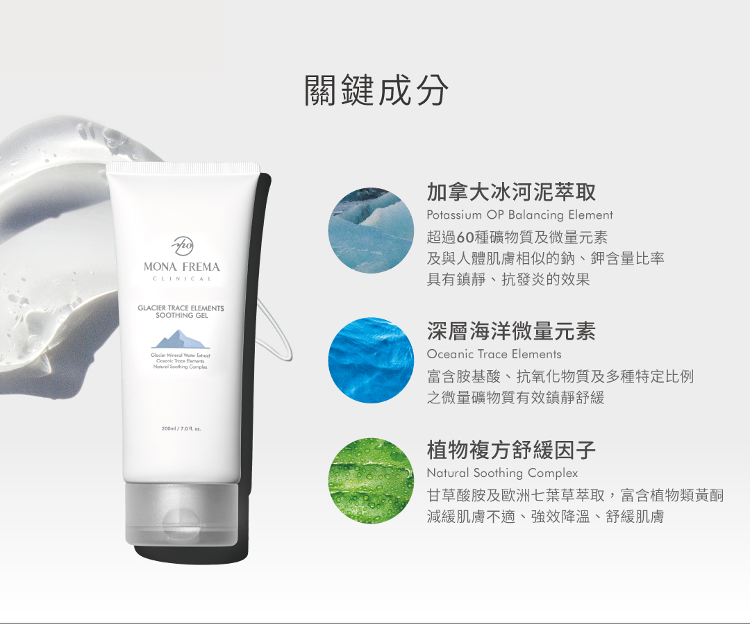 專為醫美術後、高溫熱傷害打造的舒緩凝膠,蘊含冰河泥萃取、多種微量礦物元素及複方舒緩因子,有效調理敏感脆弱膚況,修復表皮屏障耐受功能,使肌膚回到平衡健康狀態