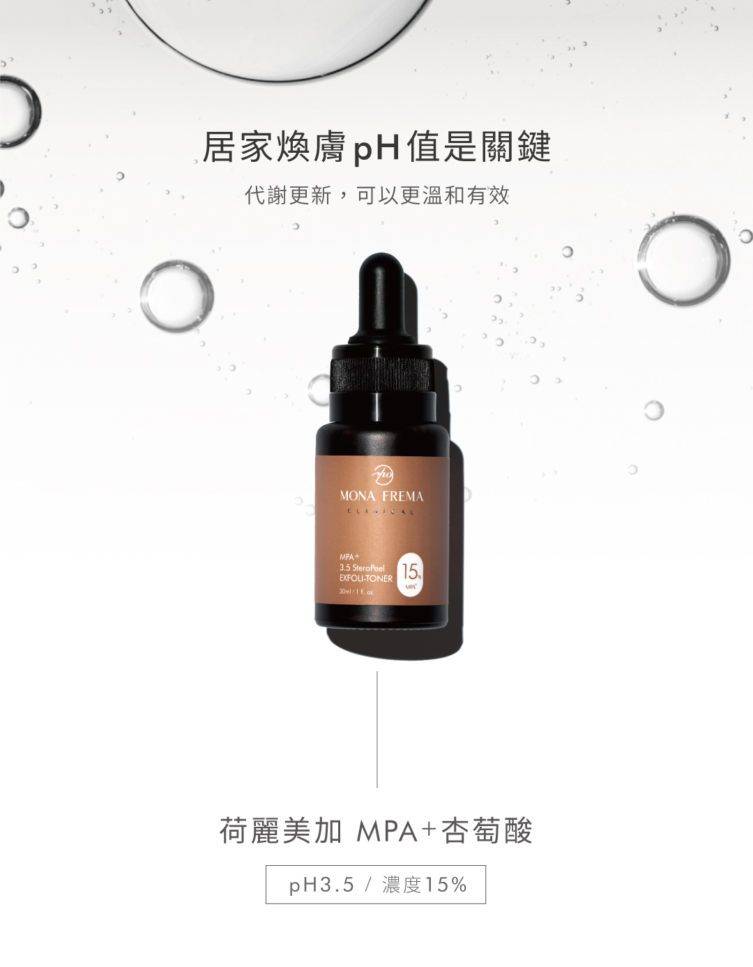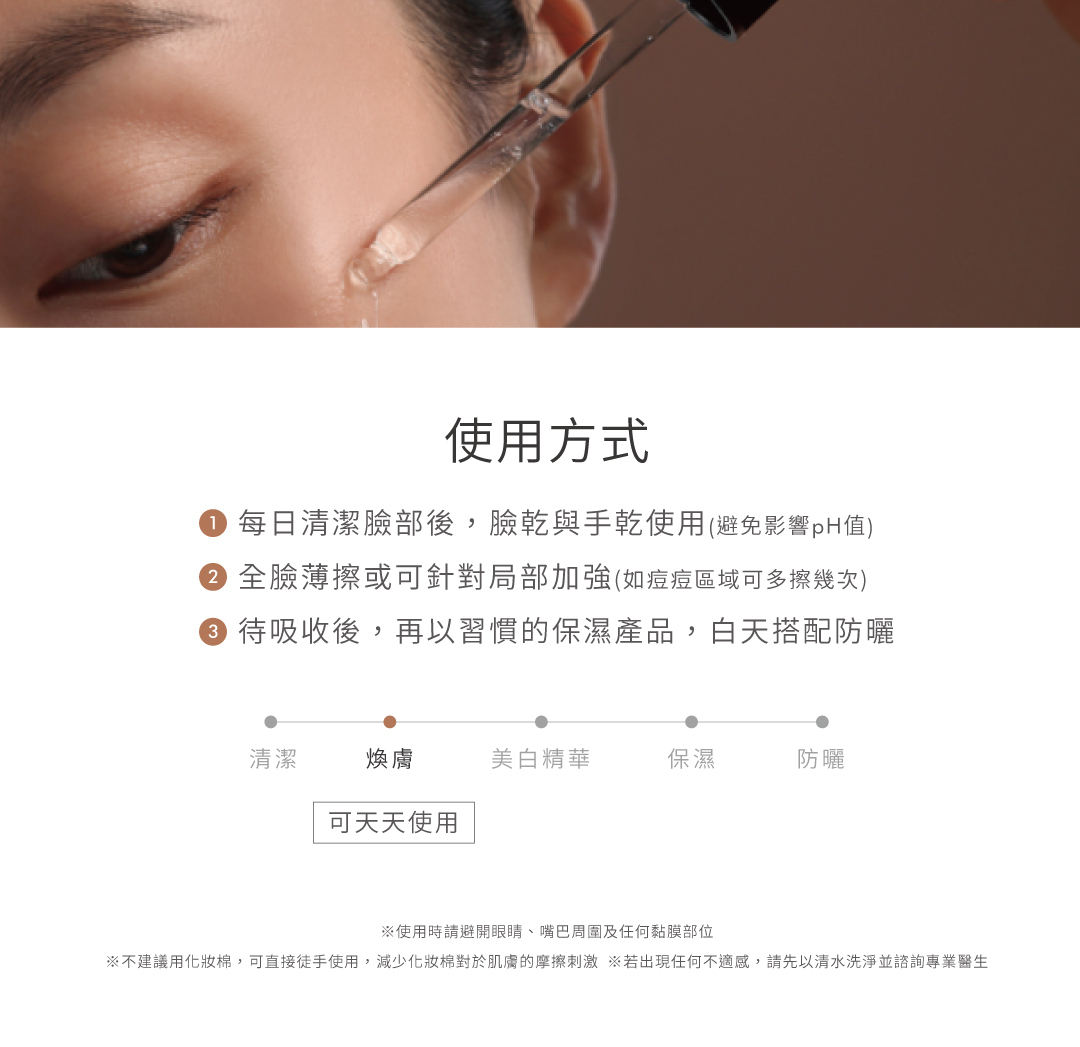 免水洗式居家去角質煥膚精華,蘊含高濃度AHA-苦杏仁酸協同多重酸類配方,零死角代謝去除堆積老廢角質,從根源有效改善毛孔粗大、膚色不均、暗沉瑕疵等各種肌膚問題,全面提升緊實細緻膚況