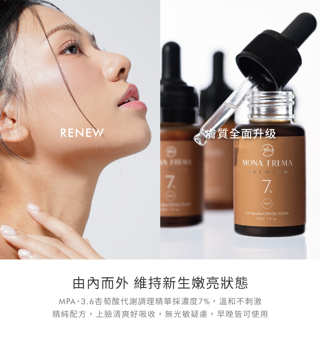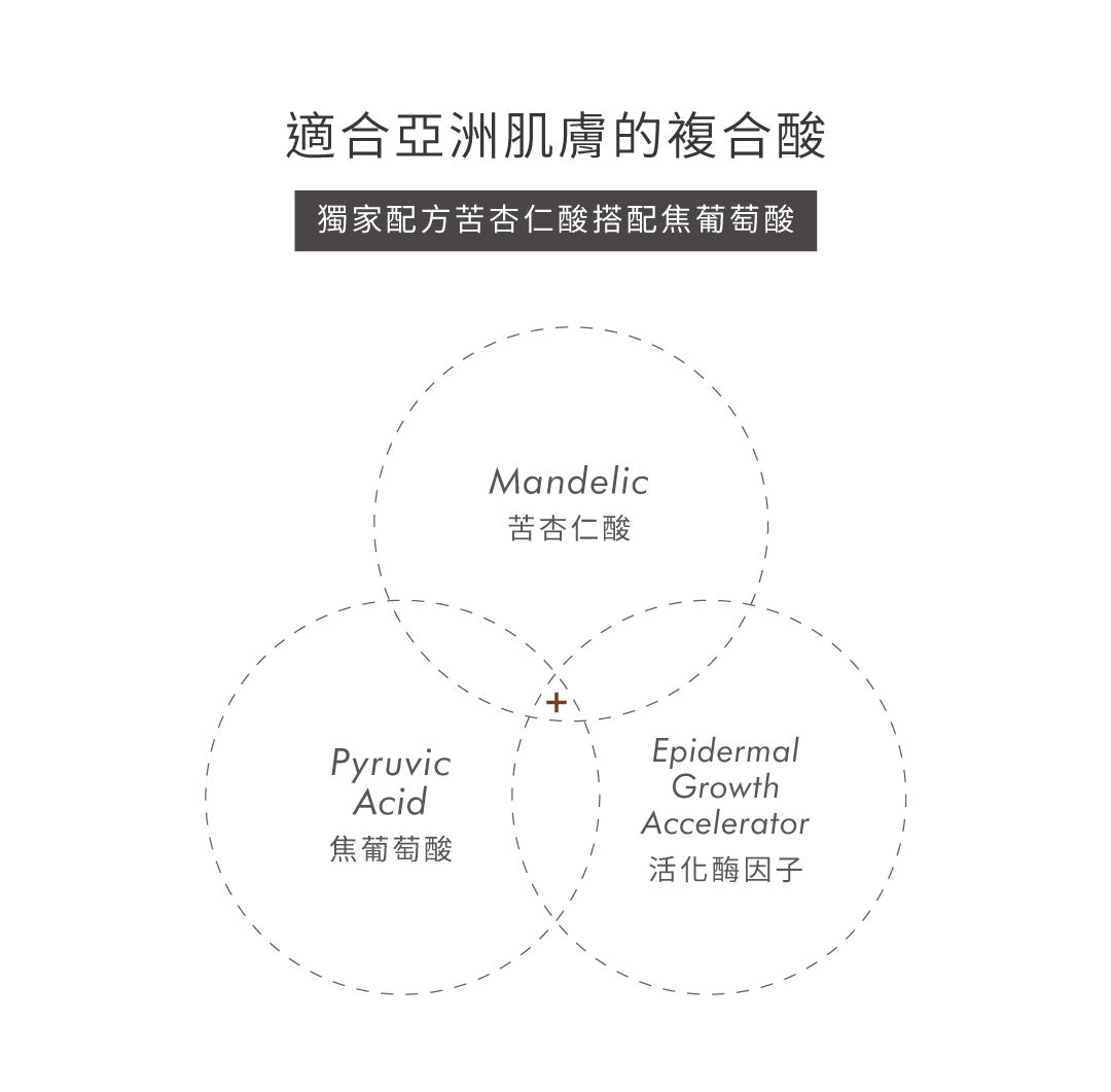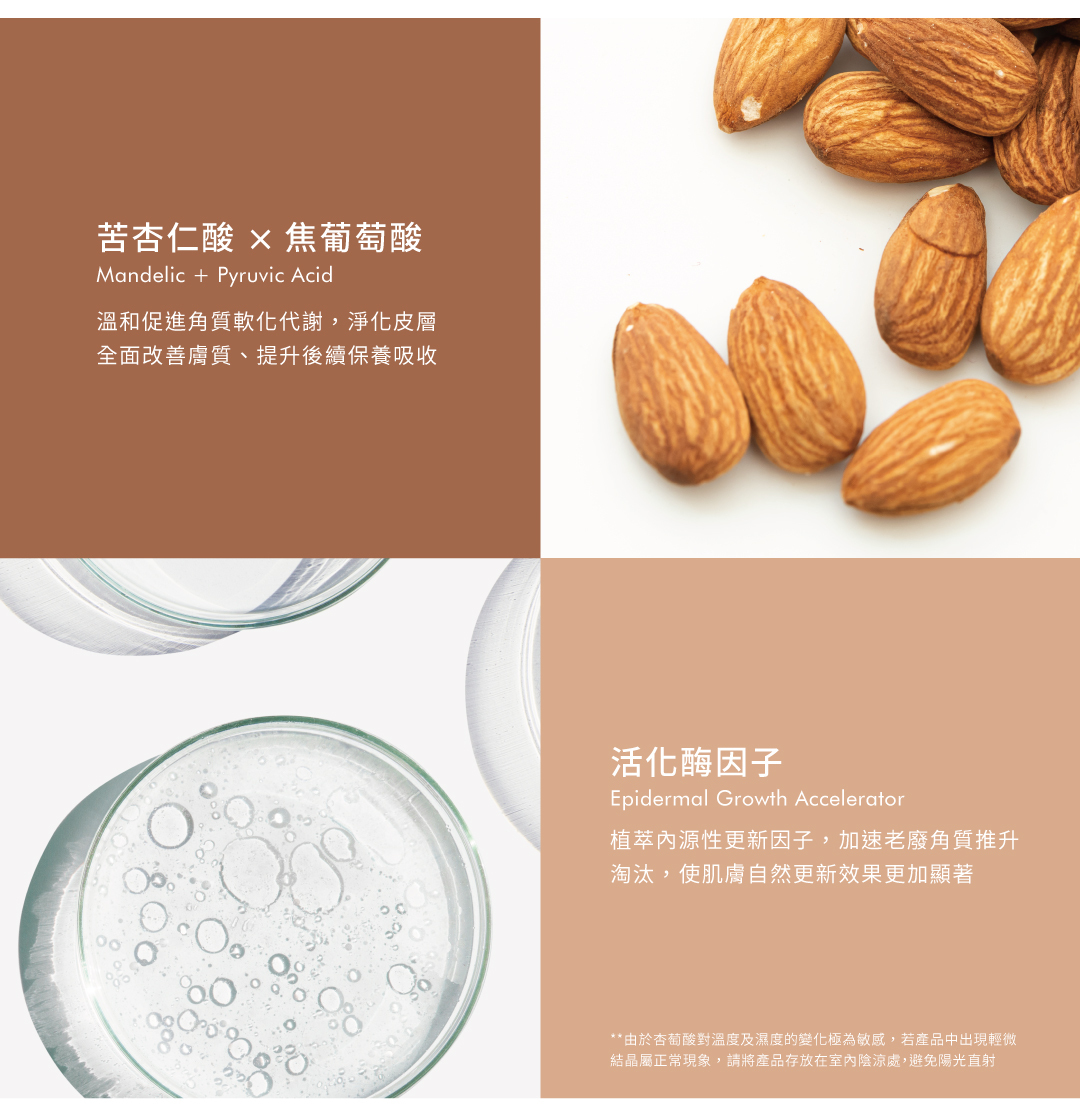 免水洗式居家去角質煥膚精華,以黃金比例AHA-苦杏仁酸與焦葡萄酸,結合新一代活化酶因子,溫和調理不刺激可天天使用,淨化毛孔,提升後續保養吸收,由內源層層煥新,使肌膚重現健康、勻亮光滑肌