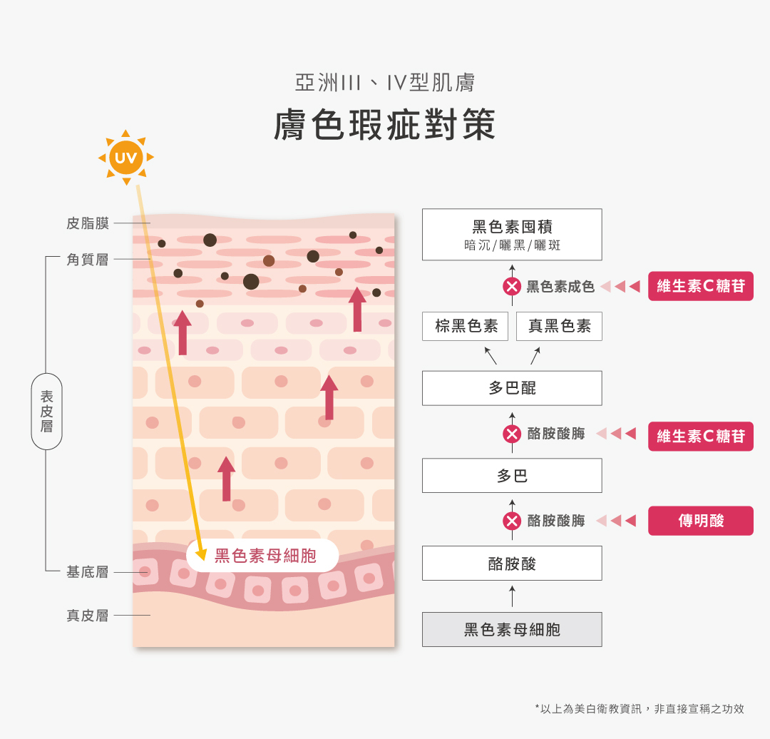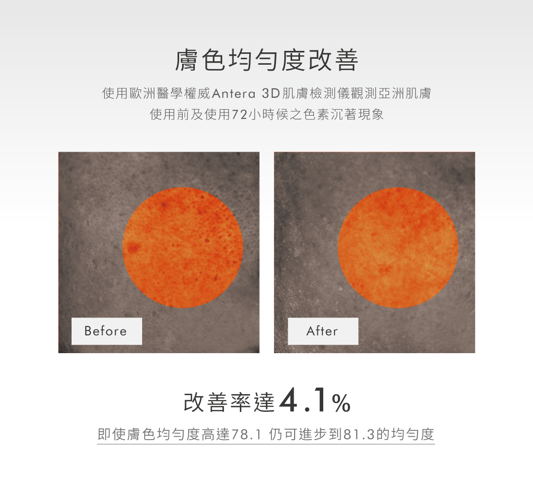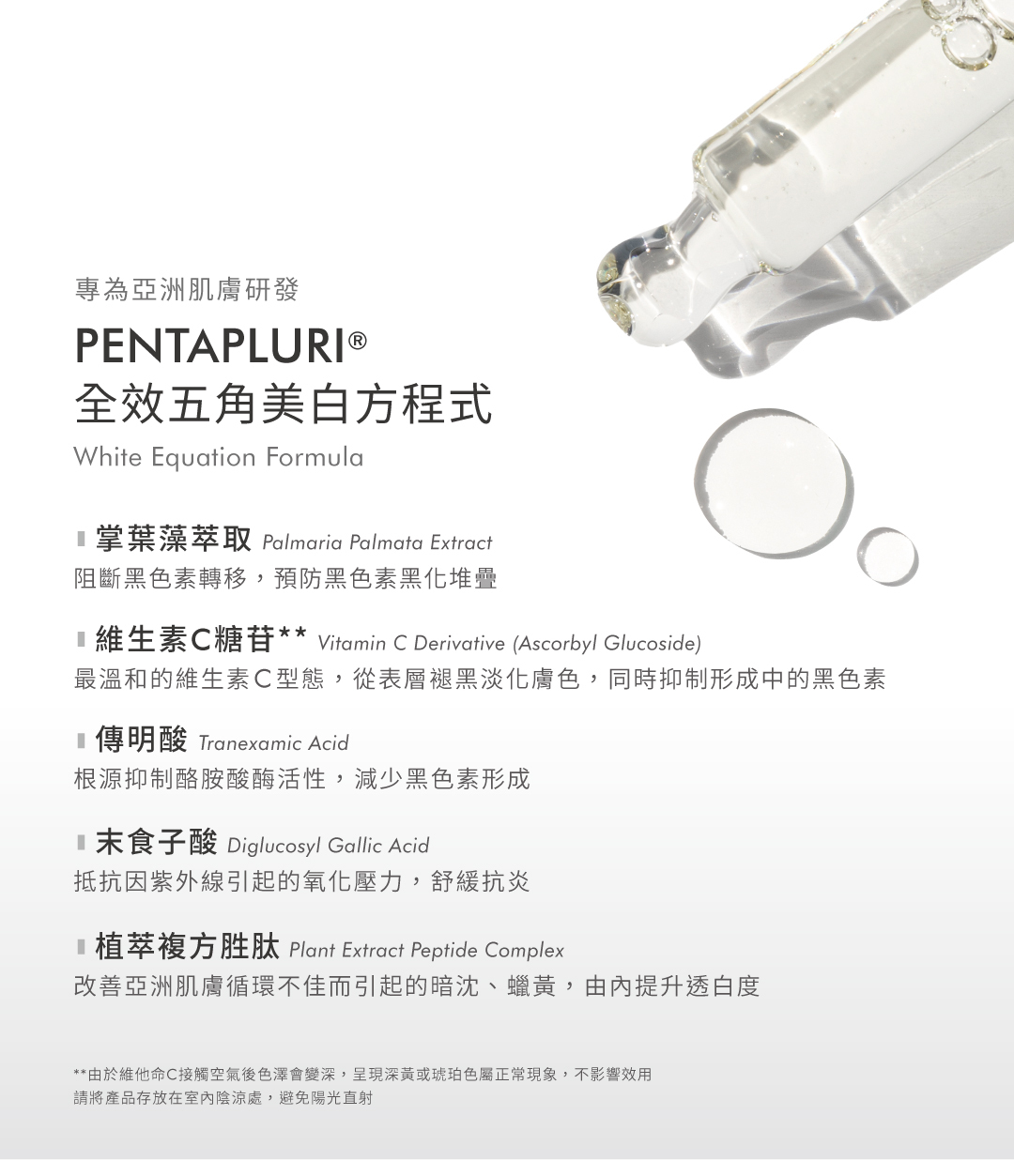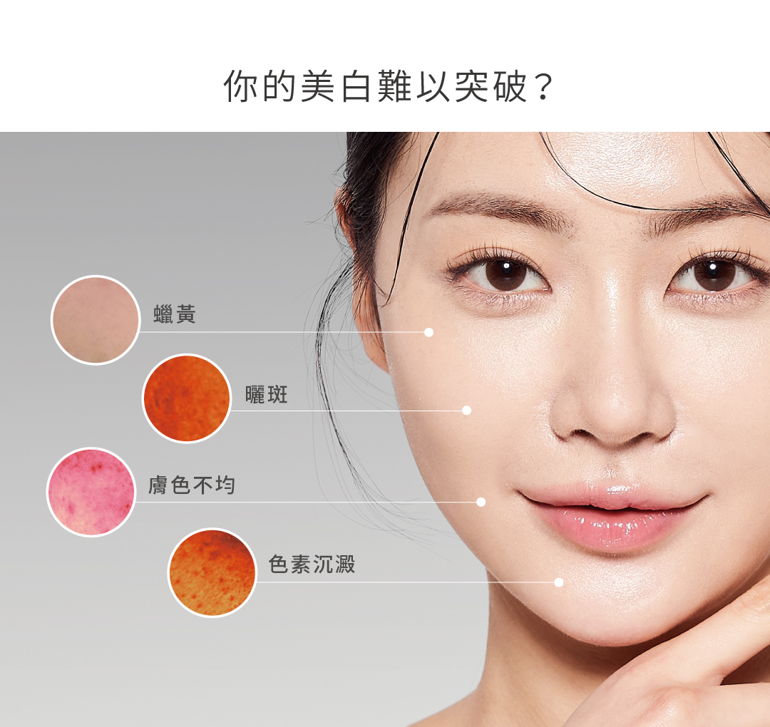 針對根源五大膚色瑕疵成因,對抗暗沉蠟黃與膚色不均,裡應外合攻破阻白障礙,全面提升肌膚白皙透亮光澤