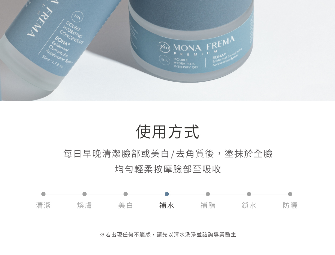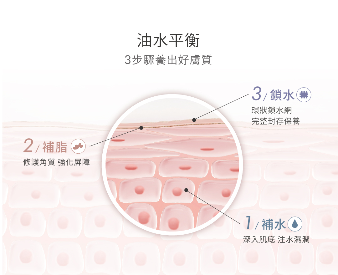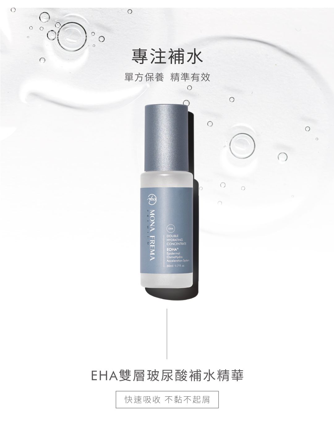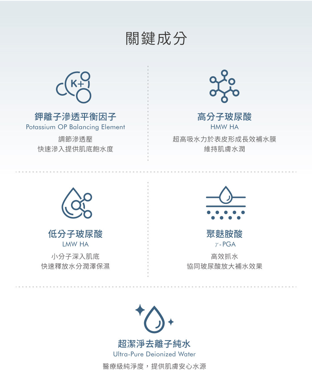 運用滲透壓補水技術,結合高、低分子雙層玻尿酸及多重高效保濕成分,輕盈不黏膩,滲透肌底深層直效補水與修護,促進肌膚鎖住水分,提升肌膚水、潤、彈,養成透亮健康肌